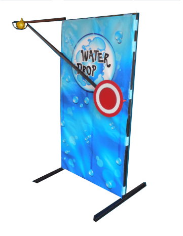 Toucher la cible rouge déclenche le mécanisme qui éclate le ballon rempli d’eau. Gare à la douche pour celui qui est assis dessous !